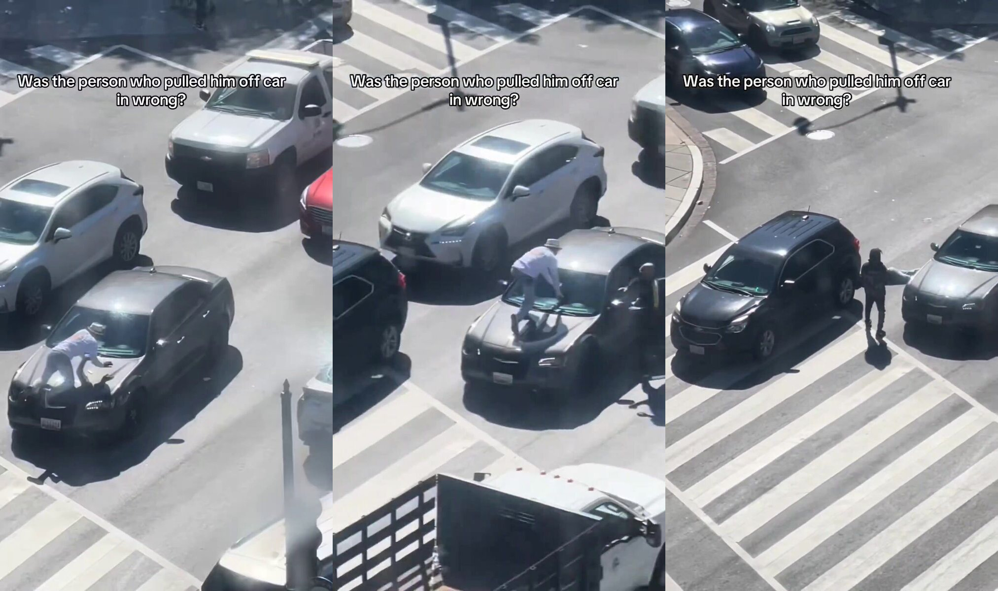 One of those “this can’t be real” moments. Some guy perched himself smack on the hood of a car, refusing to budge, trapping the poor driver at an intersection. Before anyone even had time to dial the police, some random SUV driver had *had enough.*