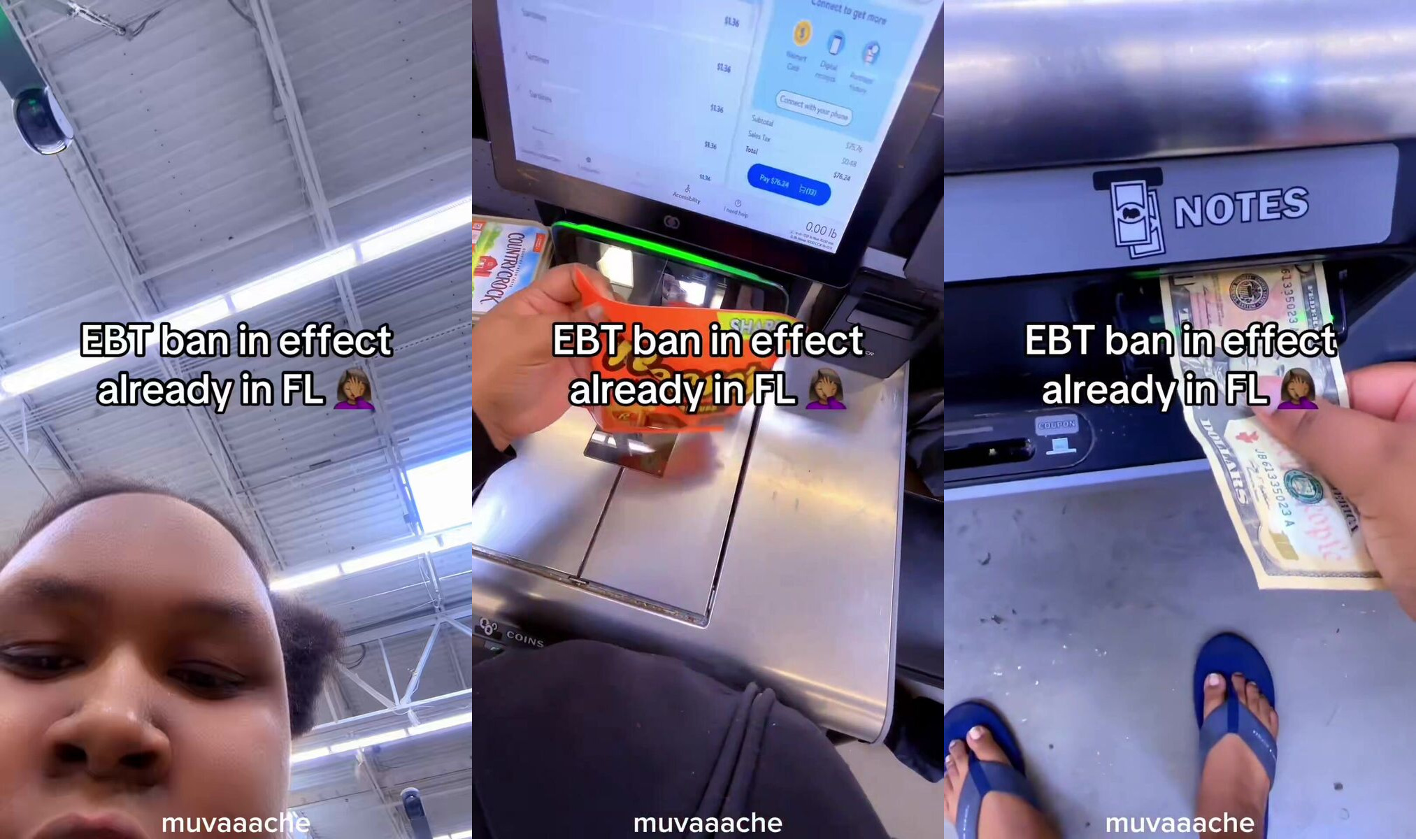 She points out that the EBT junk food ban is now in effect in Florida. At Walmart, she tries to buy a share-size bag of Reese’s peanut butter cups, but when she scans it, she’s shocked to see it marked as not covered. All her other groceries are free, except for the junk food.