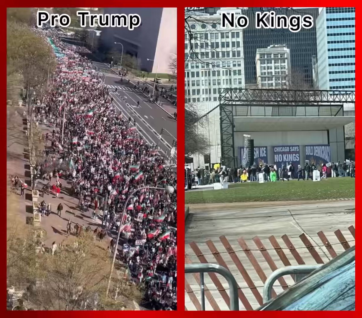 A video highlights the stark contrast between a massive pro-Donald Trump rally in Washington, D.C., which the media reportedly ignored, and a much smaller anti-Trump "No Kings" protest in Chicago that received widespread national coverage.