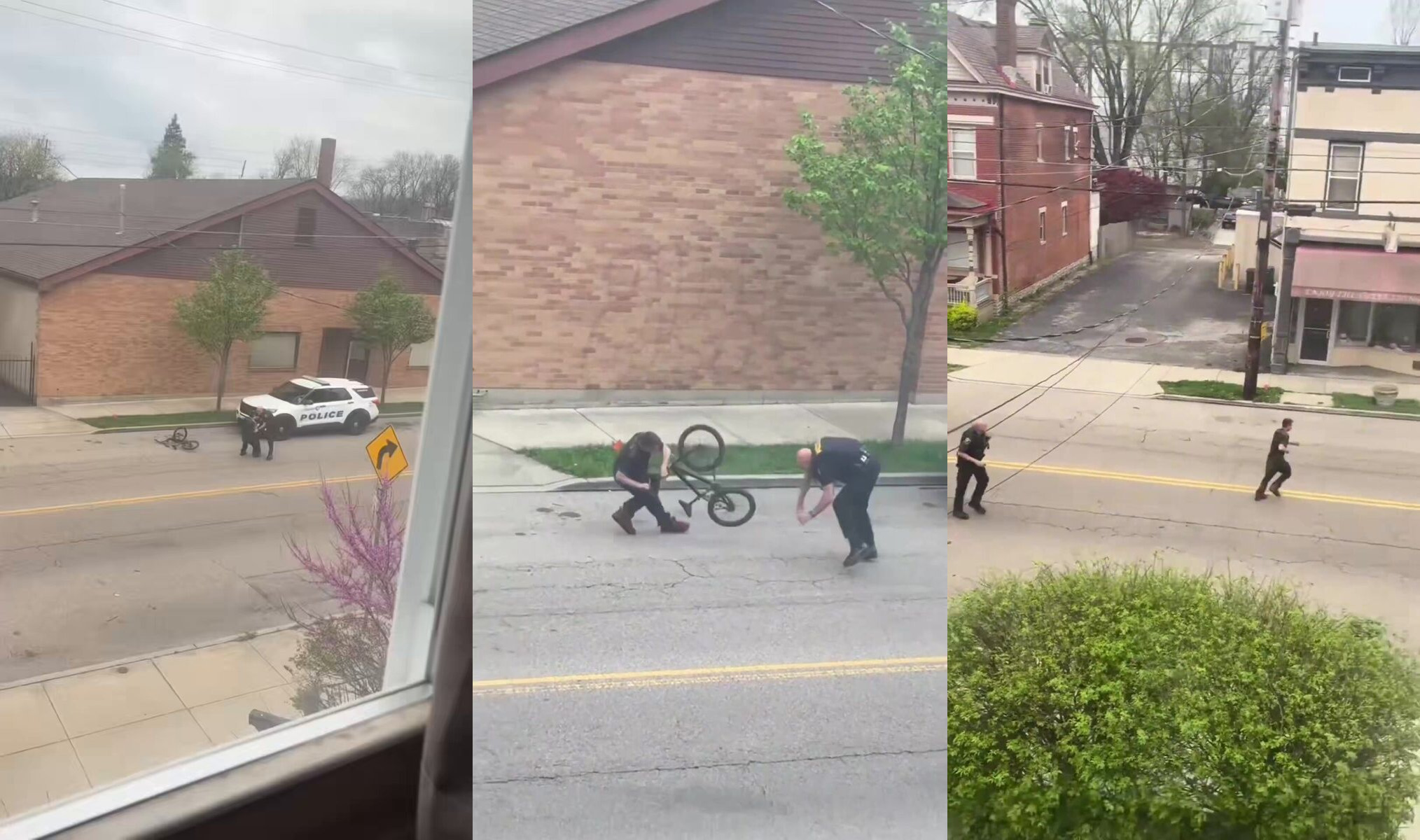 Guy escapes fight with cop, rides away on bicycle