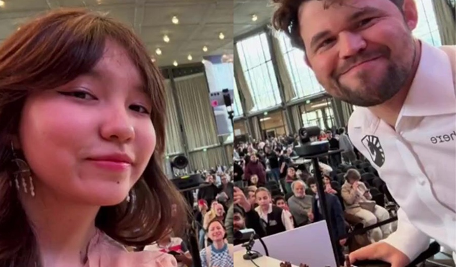 Chess grandmaster Magnus Carlsen takes a selfie with his opponent before reporting her for possessing a phone.