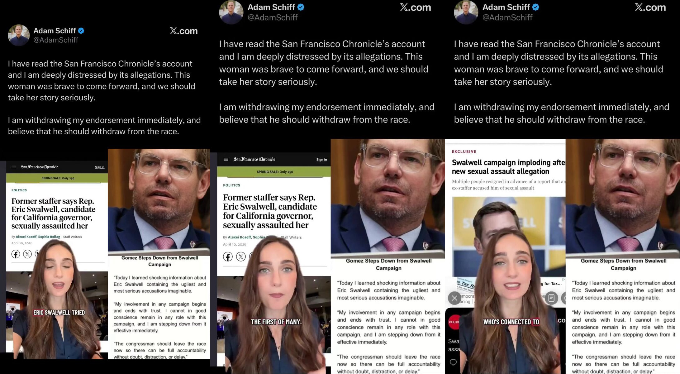 Adam Schiff has withdrawn his endorsement of Eric Swalwell for California after sexual assault allegations surfaced. Fang Fang’s former partner seems to be on his way out, circling the drain of the political swamp.