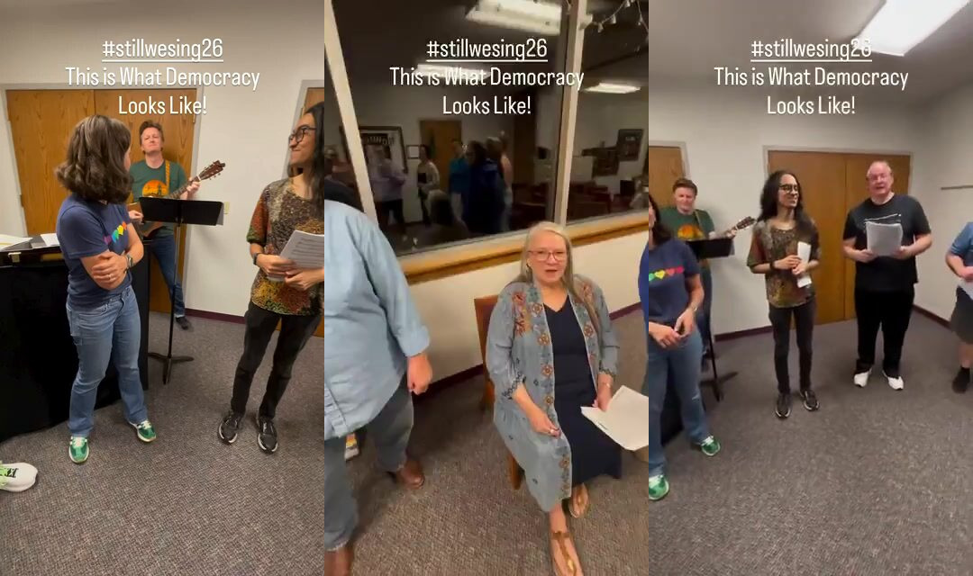 They say this is what Democracy looks like. No. this is what a room full of weirdos singing looks like. There. That's the point.