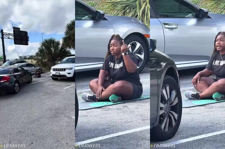 A woman sits on a yoga mat on the ground to save a parking spot, flipping off a driver who arrived first. She keeps insisting she doesn’t consent to being recorded, as if that changes anything. The highlight: a parked car nearby starts getting ready to leave.