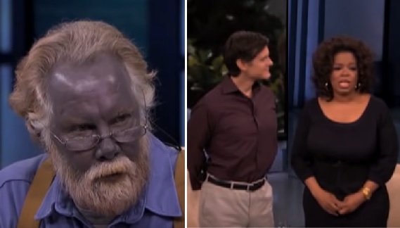 This is Paul Karason. He ate some weird stuff and turned blue, literally. He talked with Oprah and Dr. Oz about it. The video description said: "In 2008, the world met Paul Karason, a man who literally turned blue after taking copious amounts of colloidal silver, a once-popular home remedy, having both drunk it and rubbed it on his skin. Five years later, at 62 years old, this medical wonder and Internet sensation died of a heart attack unrelated to his silver intake. Watch the original Oprah Show interview as Oprah and Dr. Oz listen to Paul's story and try to figure out exactly how the shocking transformation came to be."