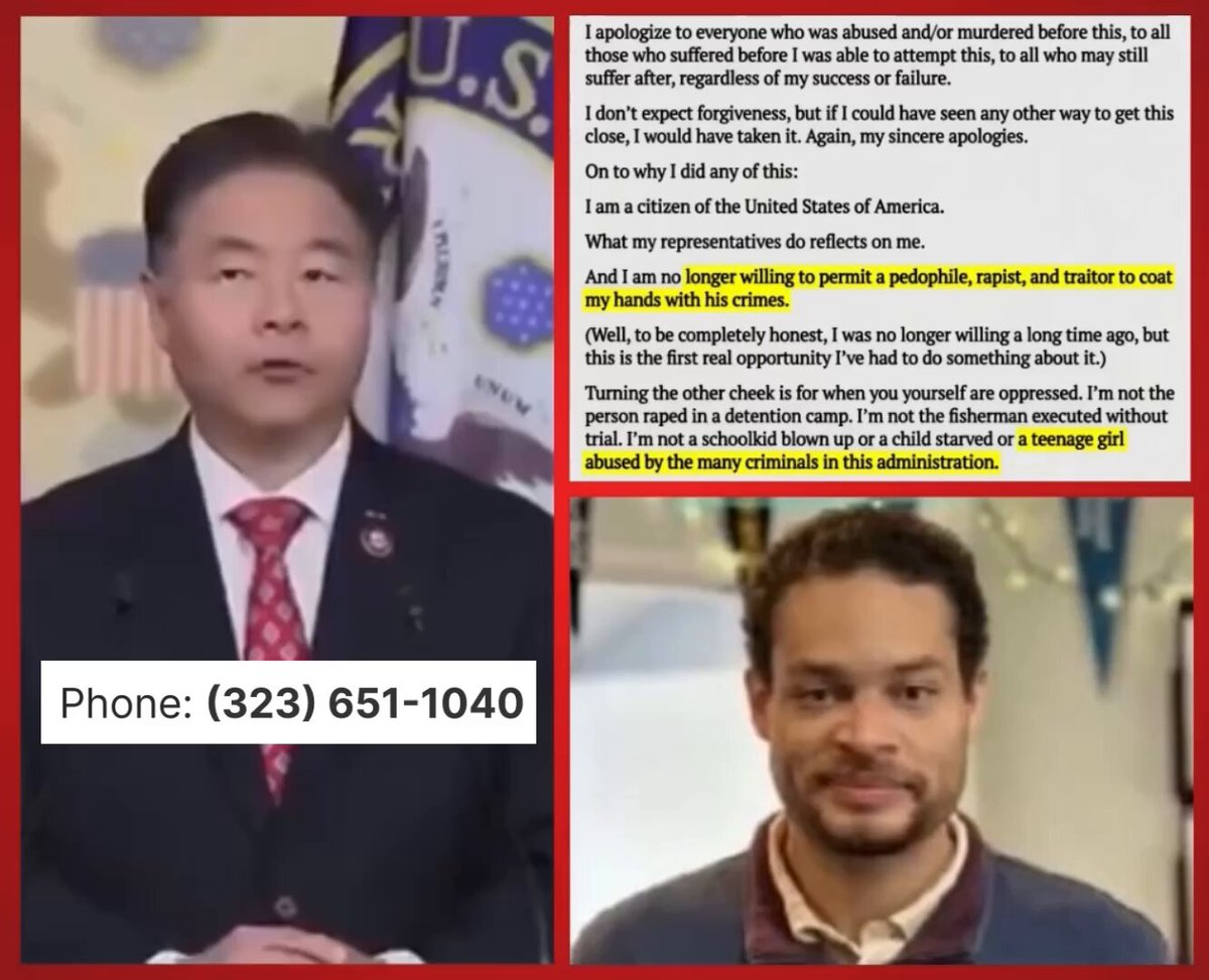 California Rep. Ted Lieu is now facing mass calls for expulsion after it was revealed that last night’s attempted assassin, who is from California, acted on the exact lies he made about President Trump. Call and ask why he is convincing his constituents to commit acts of terror. - report by Right Angle News.