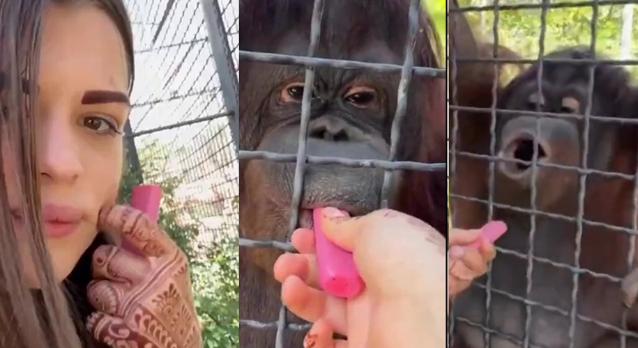 Russian boxer Anastasia Luchkina lets endangered orangutan hit the vape