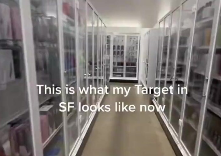 This video comes from a TikTok user who said this is what a Target in San Francisco looks like. The merchandise in the few aisles of the video are mostly all locked up behind security shelves or doors. It's unclear when this video was actually recorded or what Target this might be at, so there isn't too many other details just yet. My guess is that the store locked up all the items that were stolen the most. If people would stop stealing, then things wouldn't have security devices or be locked behind a door.'