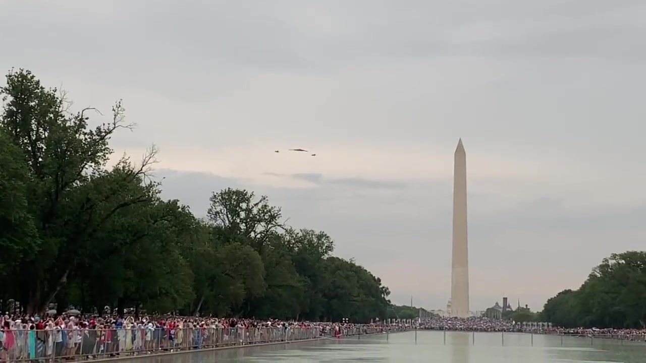 The fighter jets were followed by a Sikorsky VH-92 helicopter, soon to be the new Marine One that flies the president, along with two V-22 Osprey tilt-rotor aircraft from Quantico.That was followed by a flight of four of the Army’s AH-64 Apache attack helicopters, from an origination point the president did not mention.And the grand finale, as far as the air component of the event, came as six F/A 18 Hornets from the Navy’s Blue Angels demonstration team first flew over the Reflecting Pool to the Lincoln Memorial then a short while later, flew back the other way over the memorial.