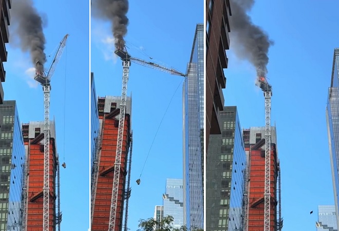 Photos and videos posted on social media showed flames bursting from the engine compartment of the crane hundreds of feet above street level.