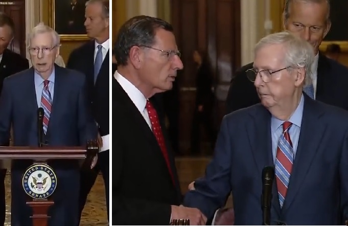 Mitch McConnell looks like he was frozen during a news conference and was escorted away from cameras after people came to help him. He was able to return to the podium a few minutes later, but this video was very weird and somewhat scary for someone his age. NBC News reported on the details of Mitch McConnell freezing at the podium during the news conference. The report said: