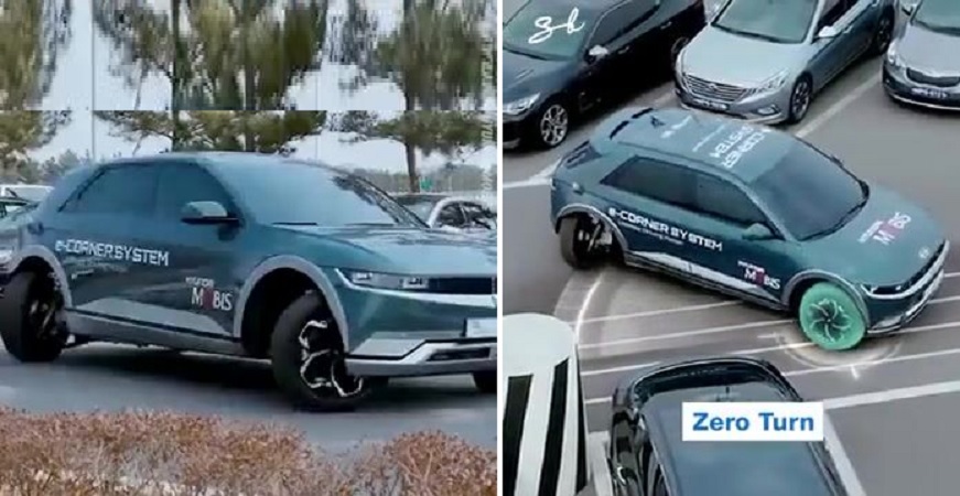 Such steering angles not only allow the Ioniq 5 test car to do a real, fully sideways crab walk—not just at a slight forward angle like the Hummer—it can also drive diagonally, pivot in place, and even pull off a true zero-degree turn without needing to drive each wheel individually, since all four wheels can steer.