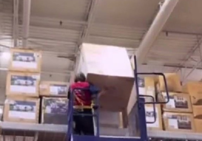 Would you resign if someone posted a video of you struggling with a big box at work? This guy did because he's not interested in anyone who comes to the store looking to make a comment about the video or anything like that. He's all the way up at the top shelf and the box is huge. Not really sure what's in there, but it seems like the box is just way too big for the guy to deal with and he definitely needed an extra hand or two. Nothing wrong with that, we all need help once in a while if something is either too big, an awkward shape to hold with one person, or too heavy.