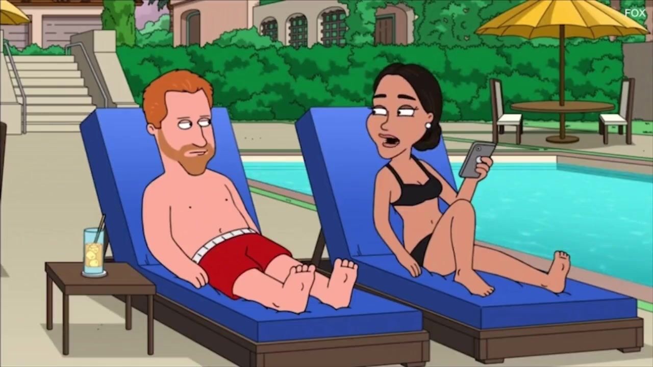 In a classic Family Guy cutaway scene, a cartoon version of Harry and Meghan appear, sitting by a pool in their swimwear.