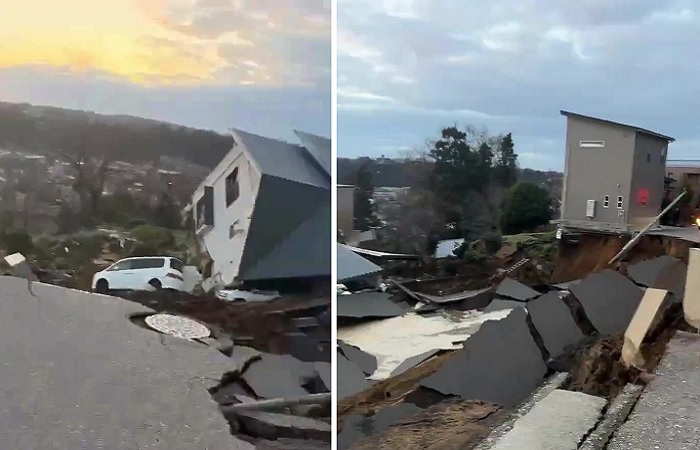 Road crumbles, house falls over during 7.6 earthquake in Japan