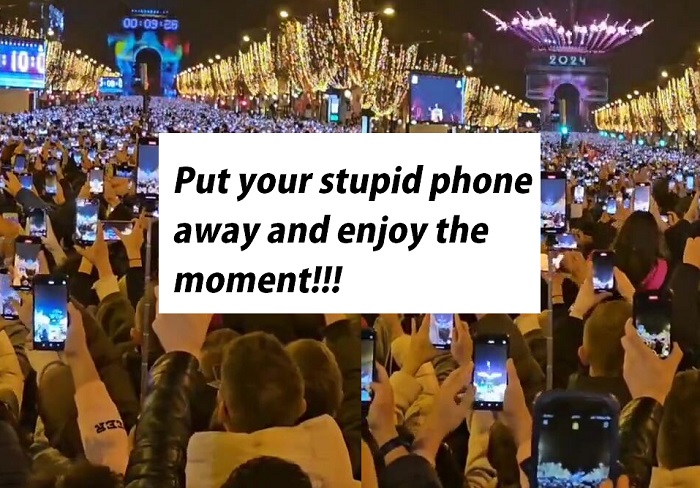 Smart phones are ruining live events. Turn off your phone and enjoy the moment. No one cares about your fireworks videos on social media. AND, if you really want a video of the fireworks or ball drops - then just download the good copy from the people HIRED to record this stuff. The smart phones and social media are the worst inventions ever, the total downfall of society. We have smarter phones and dumber people. This is a major problem for the future of our society, that's for sure.