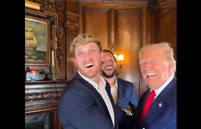 I don't know what's going on in this world, but I know this is a great video. Donald Trump and Logan Paul are doing a stare-down, like they do for professional fights, and Trump couldn't hold in his laughter. They both started laughing hysterically and embraced, enjoying the moment as they tried so hard to be super serious. This is a guy who gets it.