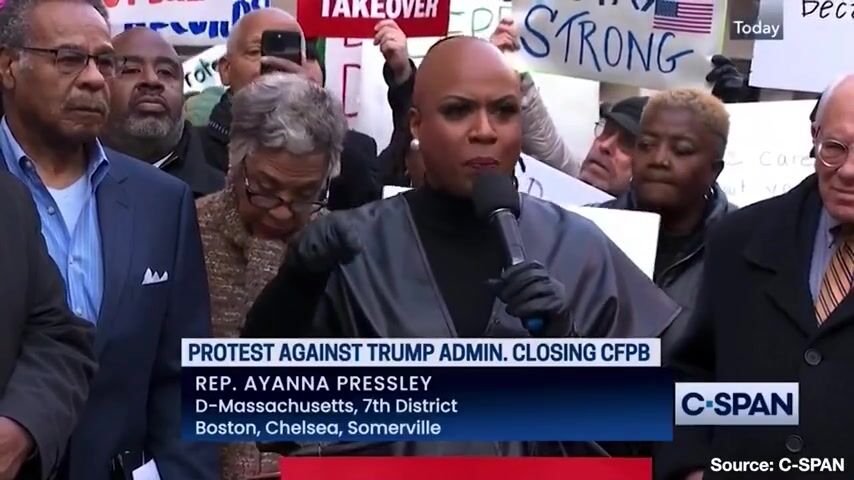 Ayanna Pressley was dressed up like she's in a low-budget science fiction movie villain as she makes a really ridiculous statement. She said Democrats are willing to work with anyone who's serious about censoring the American people. Has she never read the constitution? We have freedom of speech, just like she has the freedom to wear whatever that outfit is. My gosh, it's horrible. She looks like a villain.