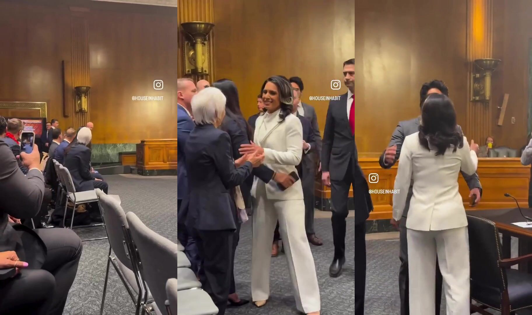 Tulsi Gabbard enters for her Confirmation hearing looking spectacular, sparking a USA chant.