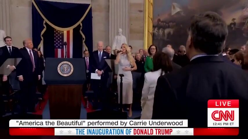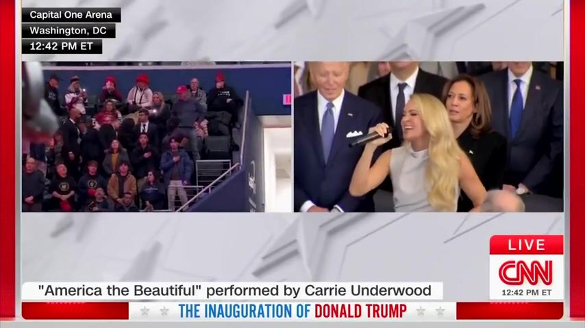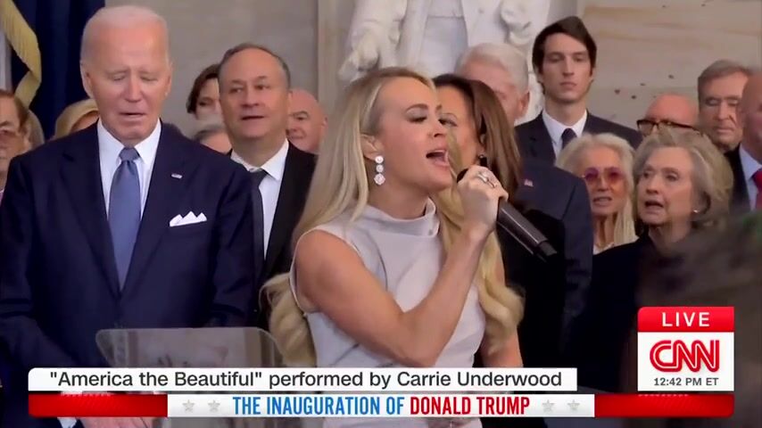 Carrie Underwood sings 'America the Beautiful' on her own when the music didn't kick in. I guess they had a technical difficulty or forgot the music. Either way, she did good. She's a great singer. Meanwhile, check out Joe Biden in the background. Was he starting to drift off into a sleep? He always looks sleepy these days. It's a shame what the Democrats did to him. I bet he wanted to retire years ago, but the Dems turned that man into a puppet. He didn't even know what he was signing in the executive orders. He was obviously being bossed around, but no Democrats want to admit it.