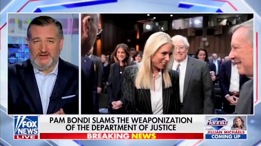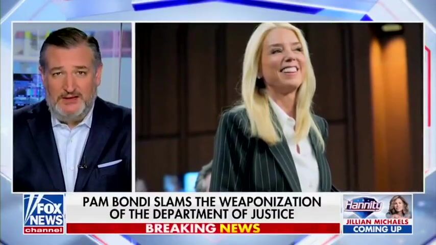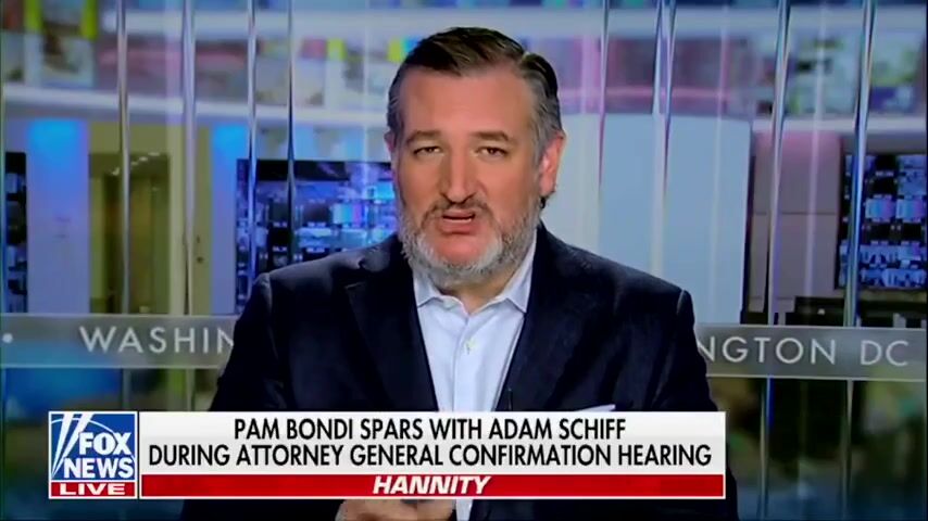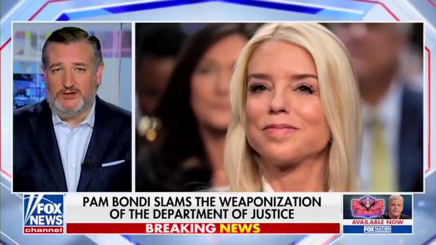 Sen. Ted Cruz took a break from asking people for donations to make a good comment about Pam Bondi. Ted said, "I don't want to see a Republican DOJ or a Democrat DOJ. I want to see a DOJ that follows the damn law, and I believe that is exactly what Pam Bondi is going to do."