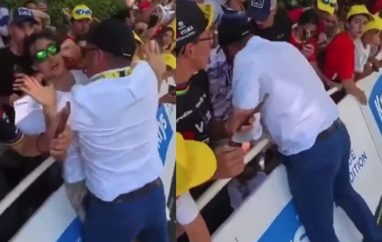 Security wasn't playing around at the Tour de France! A Free Palestine activist stormed the Tour de France course wearing a keffiyeh to protest the Israeli team. Security grabbed him by the ears and threw her over the barriers.