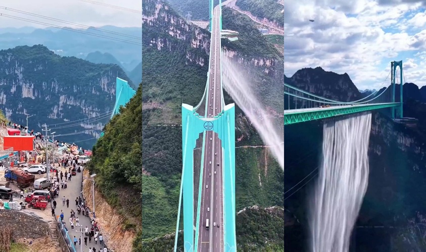 China officially opens the world’s tallest bridge, completing the project in under 4 years. The bridge features a restaurant at the top, a whopping 2600 ft above the river. The bridge not only cuts a 2-hour drive to 2 minutes, but also features as a theme park with a glass skywalk, a high-speed glass elevator, and a waterfall off the edge of the bridge. Visitors can also bungee jump off of it. The Huajiang Grand Canyon Bridge is 2050 feet above the river and spans 4600 feet over the river.