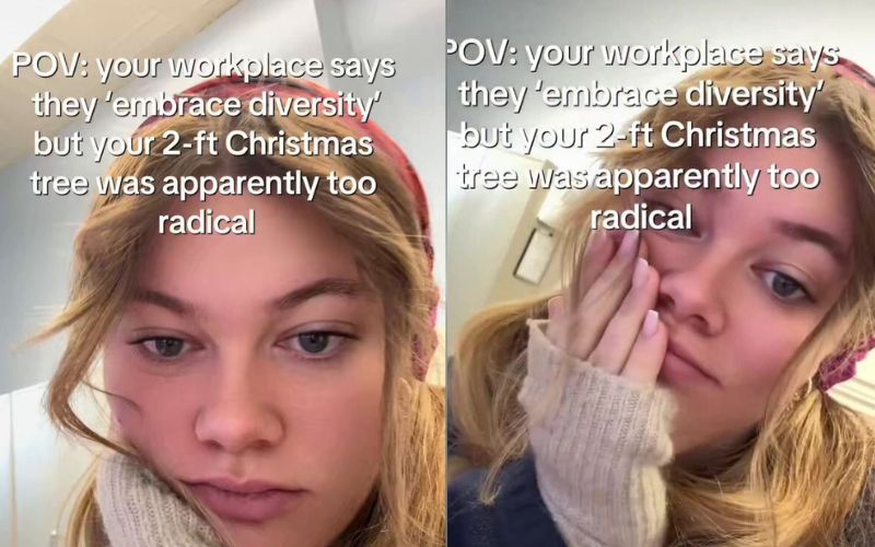 She was told to take down her Christmas tree or risk losing her job. “Your workplace claims to ‘embrace diversity,’ but apparently your 2-foot Christmas tree was too much,” she said, showing how she had to load it into her car to take it home.