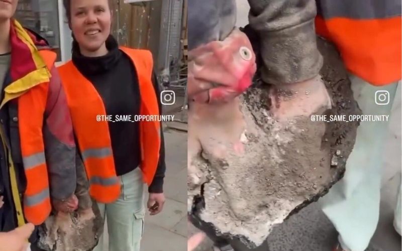 Two protesters have hands stuck in concrete