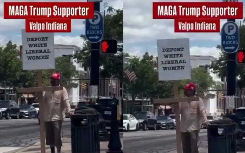 A Trump supporter mocks liberal protesters with a sign of his own sayin "Deport White Liberal Women."