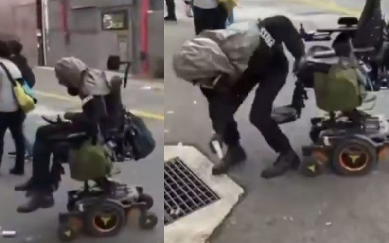 A wheelchair-bound ICE protester appears to experience a moment of divine intervention, standing up from his chair to pick up something he dropped. These are supposedly paid actors.