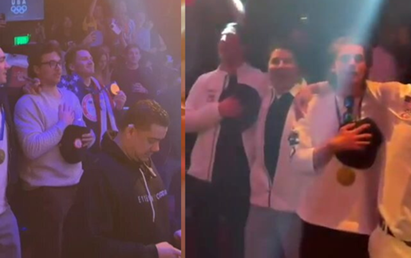 Men's USA hockey team sings National Anthem at Miami nightclub